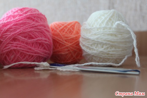 Итак, вяжем Машеньку. Для работы нам понадобятся нитки 100% акрил, немного материала для набивки (у меня - холлофайбер), спицы и крючок №2,5