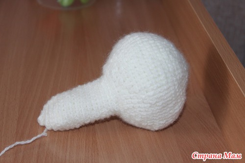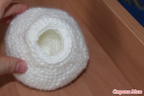 По краям головку набиваем, оставляя в середине место для "пальца". На оставшихся 24 петлях вяжем "палец" (т. е. в отверстие должно вмещаться два пальца - указательный и средний, и если 24 петли для двух пальцев маловато, то в 19 ряду головки можно не делать убавок, и вязать "палец" на 30 петлях). Довязав "палец" до нужной высоты, делаем три ряда убавок: