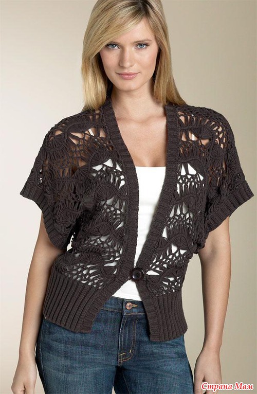 Я начала сначала спинку, уже связала 2 полосы и соединила, думаю, что их д/быть 3 полосы на спинке. После спинки планирую начать перед, т.е. верхнюю его часть, потом соединить перед и спинку и присоединить полосы нижней части. Вот как-то так. Ну и в последнюю очередь будет обвязка.