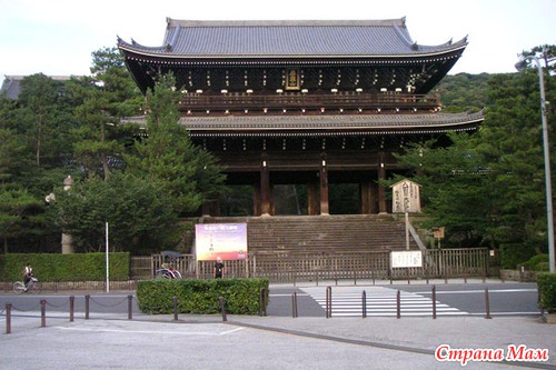 Храм Чионин. Этот храм был построен в 1234 году сектой Йодо в честь своего основателя, монаха Хонен. Он учил, что поклоняясь буддистскому богу Амиде и будучи ему преданным, можно попасть на Чистую Землю, то есть в рай. На месте обитания и служения монаха, его смерти, и была возведена церковь. В комплексе было 21 здание, начиная от общественных столовых и заканчивая закрытыми храмами. Однако время уничтожило практически все из них, пожары и землетрясения привели к тому, что старейшие сохранившиеся тут дома относятся к 1630-м годам. Но это не мешает оценить всю красоту и изящность японской архитектуры. Войти в храм можно через громадные двухэтажные ворота, затем путь идет по крутой лестнице. Ворота Сан-Мон, сооруженные еще в 1619 году являются самими большими в Японии, входя в список Национальных Сокровищ. Гордостью храма является и ее колокол. Он весит целых 74 тонны, чтобы добиться его звучания в него бьют сразу 17 монахов. Колокол Чионин также является самым большим в стране. Интересной особенностью храма является «поющий» пол. Когда в помещение входит непрошеный гость, то дощечки начинают скрипеть. Так монахи узнавали о посетителях. Внутри храма располагается статуя того самого монаха Хонена. Именно в Чионине снимался знаменитый фильм «Последний самурай». Посетители могут осмотреть не все постройки внутри комплекса, плата же за вход составляет 400 иен.