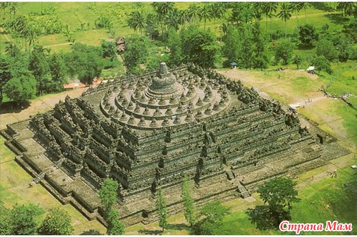 Боробудур. Этот комплекс был построен еще в VIII-IX веках правителями Явы из династии Сайлендра. Название комплекса переводится, как «буддистский храм на горе». В XIX веке голландские оккупанты острова обнаружили глубоко в джунглях массивные древние руины храма. Комплекс был построен из 55 тысяч кубометров камней. В храме содержится около 2700 рельефных панелей и 504 статуи Будды. Возможно, создатели хотели повторить внешне легендарную гору Меру, на вершине которой по легендам покоится весь мир. Строительство длилось целых 75 лет, а принимало в нем участие множество рабочих. Но всего через двести лет комплекс был заброшен. Так и остается неясным, почему люди покинули в свое время храм. Причиной возможно стало извержение вулкана и смещение центра яванской цивилизации на более безопасные земли. Храм мог символизировать лотос, расположенный на озере и в котором находится Будда. Тем более в этих местах в те времена существовала водная поверхность. Сегодня некоторые специалисты полагают, что Боробудур представляет собой огромный учебник буддизма. Ведь на барельефах рассказаны основные вехи жизни божества и принципы его учения. Чтобы прочитать все картинки паломнику надо пробраться через девять платформ и преодолеть расстояние в 2 мили. Если же посмотреть на Боробудур сверху, то он представляет собой огромный геометрический символ, который значит «мироздание». Первая реставрация комплекса началась в 1907 году, она придала ему торжественный и внушительный вид.