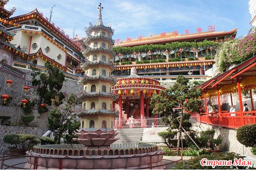 Кек Лок Си. Этот храм является самым большим в юго-восточной Азии, располагается он в Малайзии на острове Пенанг. Само название этого комплекса дословно переводится, как «Храм высшего счастья». Строительство началось в 1893 году, а закончилась лишь в 1930-м возведением Пагоды Рамы Шестого. В башне высотой тридцать метров соединились традиции тайской, бирманской и китайской архитектур. Основание имеет восемь углов, как принято в Китае, середина является традиционной для тайцев, а верхушка сделана по традициям Бирмы. Внутри самого строения находится множество статуй Будды, которых специально собирали по всему свету. Впечатляет и статуя богини милосердия Гуань Инь, а также расположенные тут черепаховые панно. Эти животные в изобилии обитают в близлежащих к храму прудах. Ведь черепахи - символ долголетия. Туристам разрешают кормить этих животных, живущих около культового храма.