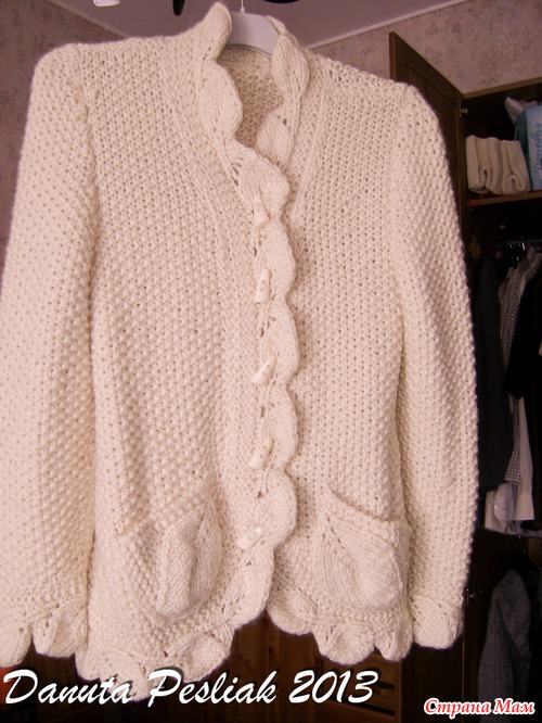 Кайма из листьев связана отдельно, а затем пришита по краю. Такие же, как на кайме, листочки вывязаны на кармашках и по краю рукавов.