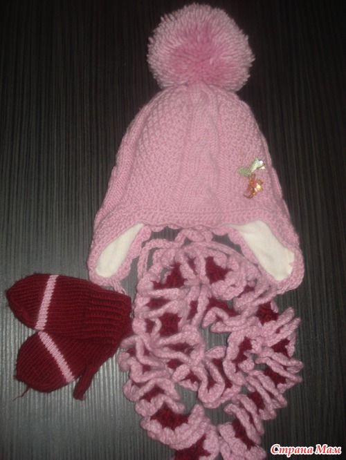 ... Всегда мечтала связать шапку с огромным помпоном... Изначально планировала вязать двойную, но не хватило ниточек. Решила сделать подклад из флиса, но, чтоб наверняка тепло, ещё и синтепон вставила. В итоге шапочка получилась супер-теплая!!! Ну и к шапочке связала шарфик и варежки.и шалостей немножко