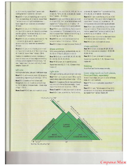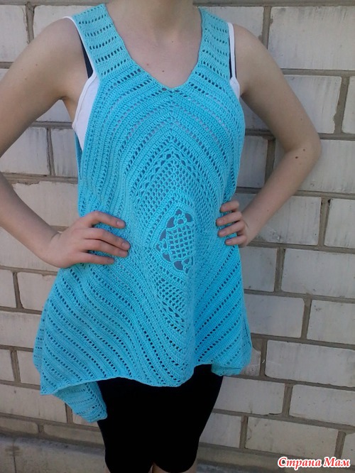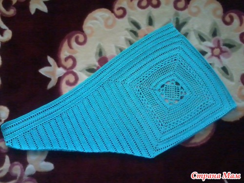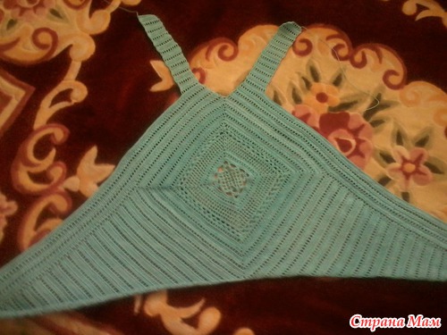Сборка: Обвязать боковые стороны треугольников и свободные стороны ромба 5 р. ст. с/н. Для бретелей по верхнему краю переда поднять по 5 п. и вязать ст. с/н. На высоте 20 см обрезать нить. Пришить кромки бретелей к верхнему краю спинки. Готовое изделие увлажнить и дать ему высохнуть."