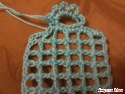 - вяжем 5 дужек из 4 ВП закрепляя их под дугу из 8ми ВП, затем вяжем еще 5 сбн до угла, и так на каждой стороне квадрата