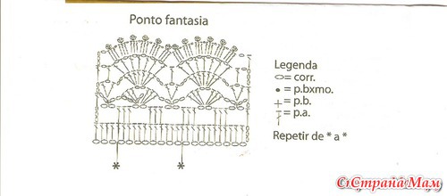 Набираем цепочку из 17 возд. п. eщe 3 возд. п. для подъема, поворачиваем работу и провязываем 4 столбика с накидом, 3 полустолбика с накидом,10 столбиков без накида. Продолжаем вязать пока не достигнем 37см от начала вязания, тогда поворачиваем работу и обвязываем фантазийным узором по схеме низ воротичка. Распределить и пришить 5 пуговиц, вывязать для них петли на другой стороне.