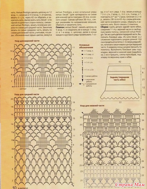 Задняя и предняя часть длинной вязаной юбки: нитью Decati связать цепочку из 74 воздушных петель, начиная от 5-й воздушной петли от крючка, вязать основным узором по схеме для верхней части. Закончив вязать по схеме, обрезать и закрепить нить. Нитью Prestigio связать цепочку из 12 воздушных петель, начиная от 4-й возд. петли от крючка, вязать ст. с/н, через 42 см. обрезать нить, закрепить. Далее взять нить Decati и по одной из длинных сторон полосы, связанной нитью Prestigio, вязать основным узором по схеме для средней части. Закончив вязать по схеме среднюю часть, вязать по схеме по нижней части, учитывая, что ряды, обозначенные серым цветом, вяжутся нитью Prestigio, а все остальные ряды нитью Decati (для наглядности на схеме для нижней части повторен 20-й ряд основного узора). Связав зубчики 36-го ряда, следуя указаниям по направлению вязания, обрезать нить, закрепить ее.