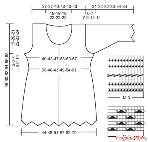Вязать по узору на высоту детали 39-40-41-42-43-44 см от нижнего края (то есть приблизительно на 5-6-7-8-9-10 см от узора по Схеме М.3).