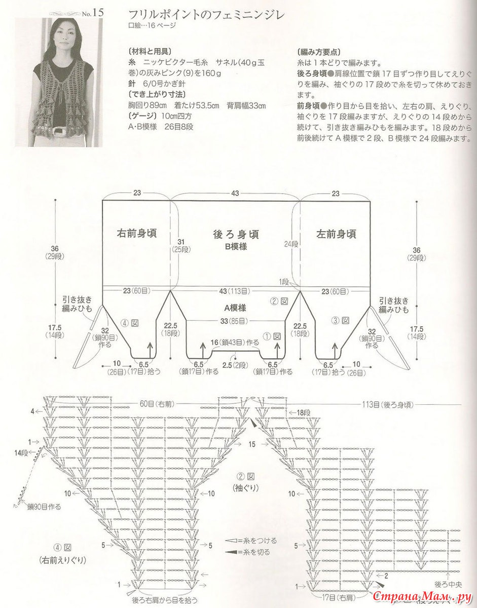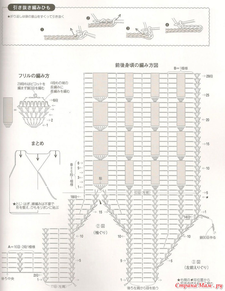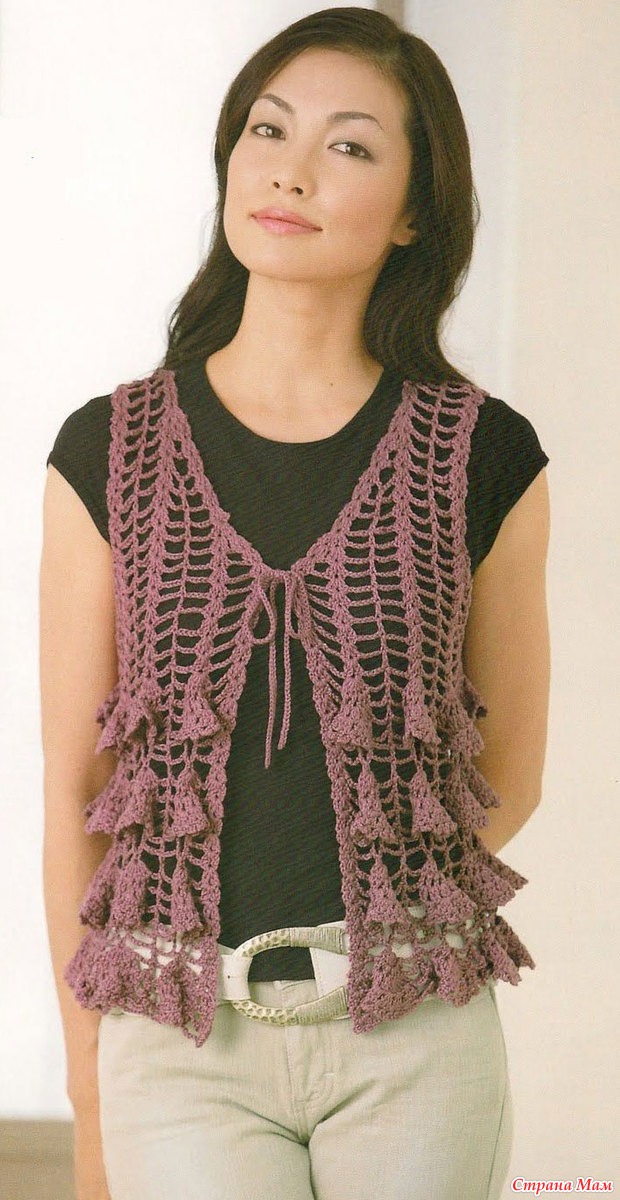 Лёгкая ажурная жилетка для лета связана крючком из хлопка. Вяжется элементарно: схемы настолько понятны, что можно легко разобраться и связать буквально за вечер. Для полочки крючком № 3,5 (6/0) вяжем цепочку из 17 в. п. и следуем указаниям схемы. Сначала спинка и полочки вяжутся раздельно, но с 17 ряда все детали соединяются и вяжутся одним полотном. Вывязывание колокольчиков так же представлено на схеме.