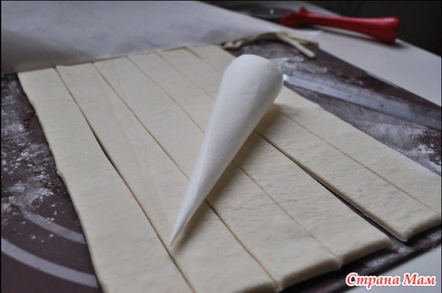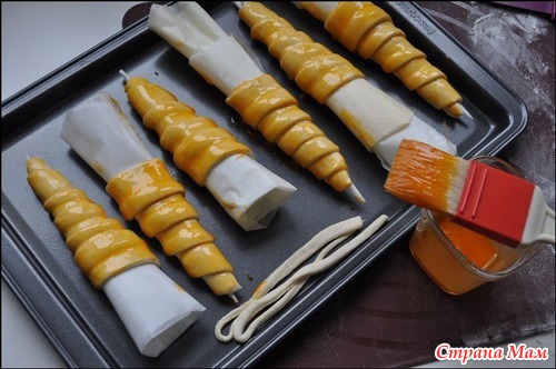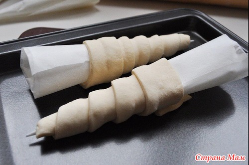 4. Обернуть каждую полоску вокруг своей трубочки, начиная от узкого конца трубочки (полоски должны перекрывать друг друга). Положить на противень.