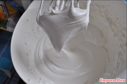 Влить в белки сироп на большой скорости миксера. Взбивать до тех пор, пока белковая масса не остынет.