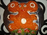 Остудить и покрыть Чебурашку. Сделать глазки из оливок, и яйца.