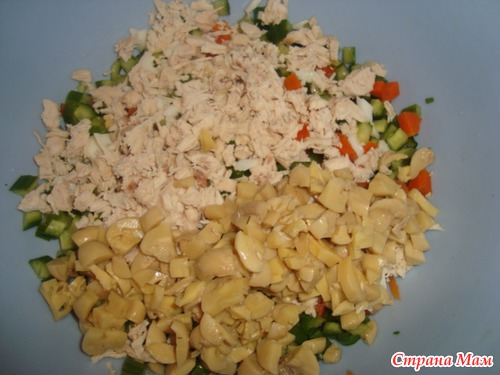 Маринованные шампиньоны, отварную курицу,