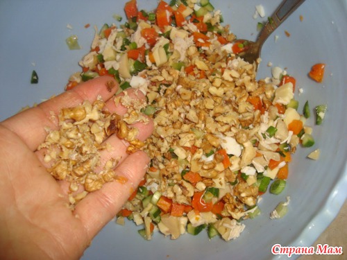 туда и грецкие орешки, все смешать майонезам заправить.