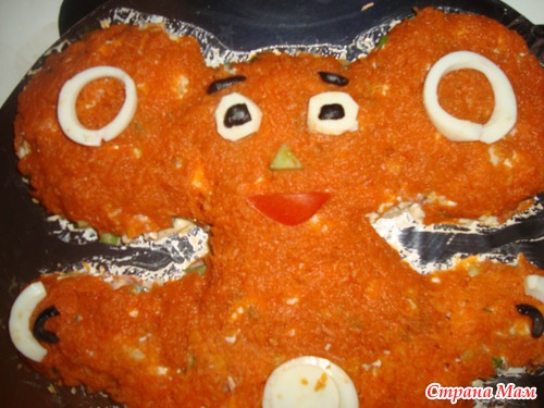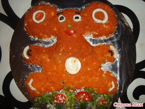 Но мне показалось, что главное в этом рецепте все же оформление, а не состав как таковой. Оформление салата в виде чебурашки мне показалось оригинальным, и вполне по-детски!