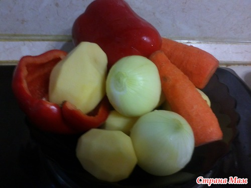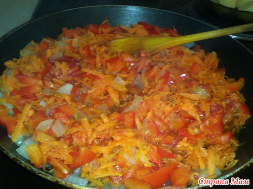 Перемешать морковь, помидоры, лук, перец, тушить в отдельной емкости.
