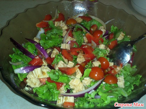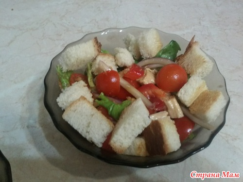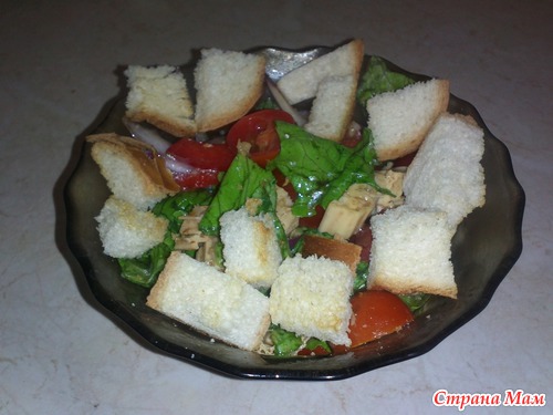Хлеб порезать мелко, подсушить на сухой сковороде. Салат перемешать, полить заправкой, подать с сухариками.