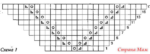 ЛИФ ПЛАТЬЯ. Открытые петли наденьте на рабочую спицу. Отметьте с каждой стороны 8-ю п. (= боковые линии). Вяжите лицевой гладью, прибавив с обеих сторон от отмеченных петель в каждом 2-м ряду 6 раз по 1 п. (накиды в изнаночном ряду вяжите перекрученными, чтобы не образовывались большие отверстия). Затем прибавьте с внутренних сторон от отмеченных петель в каждом 2-м ряду 3 раза по 1 п. Снимите с обеих сторон на булавки по 13 п. и вяжите середину лифа на средних 31 п., провязывая с обеих сторон в каждом 2-м ряду перед и после кромочных петель 3 раза по 2 п. вместе. Наденьте все петли на рабочую спицу. Крючком закройте все открытые петли верха лифа и обвяжите боковые стороны верха лифа. По переду лифа можно связать узор из дырочек по схеме 1. Верхнюю часть лифа вяжите следующим образом: 8 ст. без накида, бретель из 16-18 в. п., прикрепите бретель к центру лифа, 25 ст. без накида, бретель из 16-18 в. п., пропустите 5 п. по боку лифа и провяжите 8 ст. без накида до края спинки лифа. Затем обвяжите бретели и вырезы горловины переда и спинки кружевом по схеме, причем 1-й ряд кружева вяжите за наружную сторону косички верха лифа и бретелей. Чтобы лиф хорошо сидел, по внутренней стороне косички верха и бретелек провяжите 2-3 ряда ст. без накида.