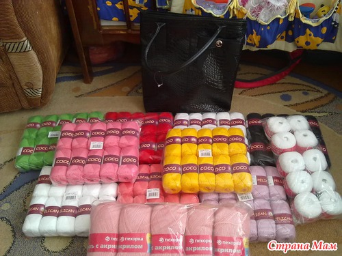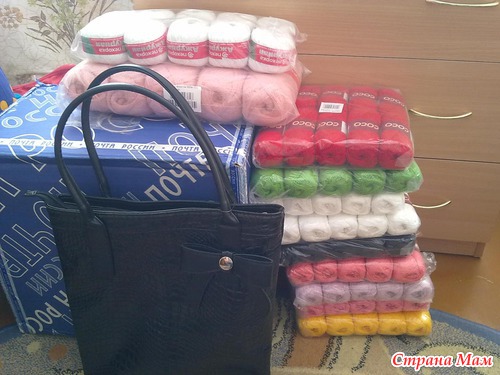 Хочу похвастаться своим приобретением. Сумочка классная, даже не ожидала, что она окажется такой мягкой и большой, я представляла ее другой. Ну и, конечно же пряжа! Хлопочек деткам на летние наряды платьица, тунички. очень, очень рада.