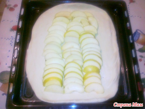 На середине выложить начинку-у меня было 2 яблока. Посыпала сверху сахаром(по желанию). Заплетаем косичку. смазать желтком изделие.