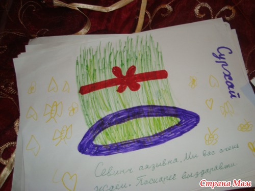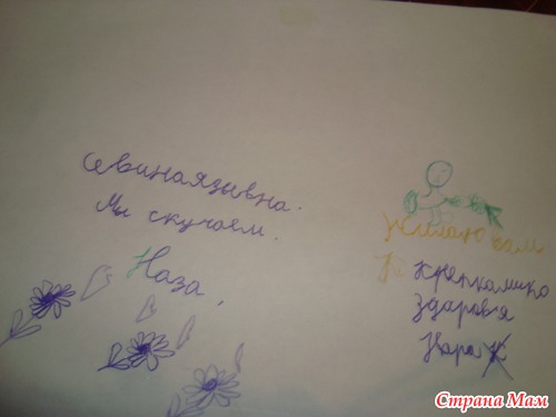 Сегодня утром примагнители его на доску, На руках у меня были Письма детей, которые они написали уже неделю назад. Это была моя идея. Я раздала им листки и попросила написать письмо кто что думает. И вот что они написали. Было так смешно. Я Улыбалась когда все читала! Все сегодня Вручили учительнице! Когда она зашла в класс, А Мы все стоим На руках цветы, Плакат, И Шоколад! Да еще и письма! Она прослезилась. ДА ДА Она заплакала, Я даже не ожидала, Да не кто не ожидал ее такой реакции. Она была очень тронута и благодарна.