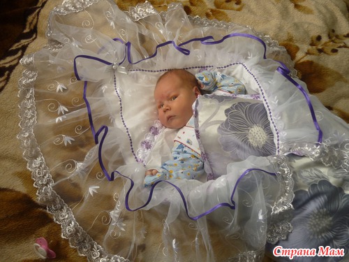Вот такой комплектик я сшила сыночку, еще будучи беременной. Пододеяльник и уголок. Назову его эконом - класса, потому что он мне практически ничего не стоил, как говорится, сшилось из того, что было. Только ткань на пододеяльник покупала, обошлась в 100 р., т. к. магазина тканей у нас не существует - покупала шторную ткань, а уголок - из остатков органзы + бейка + тесемочка
