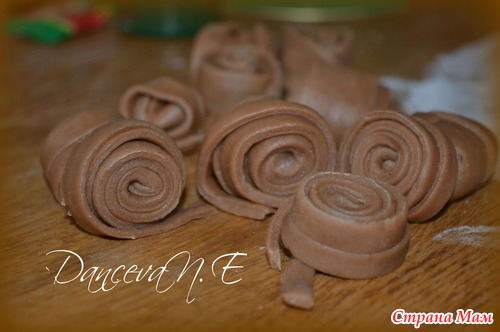 Делим тесто на 2-3 части. Из одной части раскатываем прямоугольник толщиной 2 мм. По длиной стороне прямоугольника нарезаем длинные, тонкие полоски в кол-ве от 5 до 10 шт. Скручиваем полоски в спираль.
