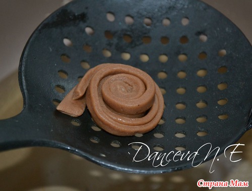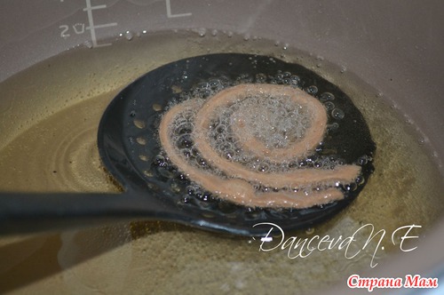 Придерживая спираль длинной вилкой жарим печенье во фритюре. Во время жарки подкручивайте печенье вилкой как спагетти