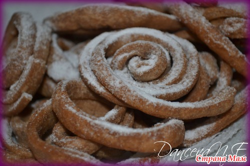 Придерживая спираль длинной вилкой жарим печенье во фритюре. Во время жарки подкручивайте печенье вилкой как спагетти