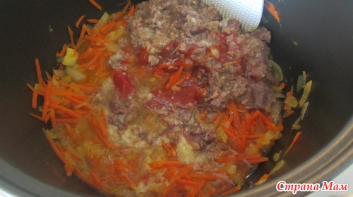 Добавляю тушенку (размять вилкой или разобрать на волокна) со всей жидкостью, что есть в банке.
