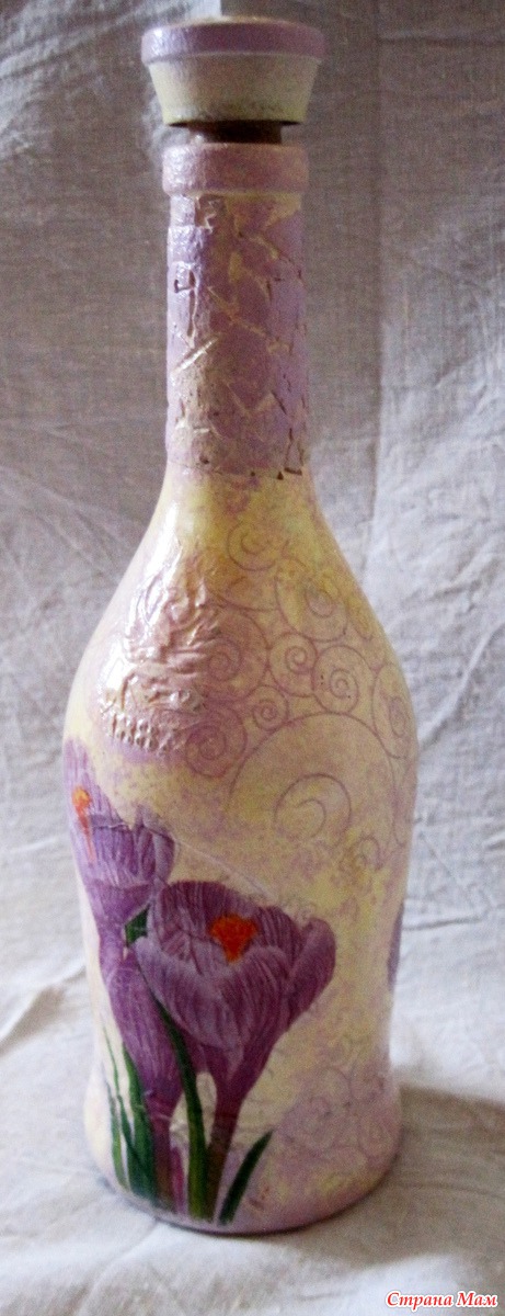 Сделала 2 бутылочки, не стала добавлять никаких блесток, страз и прочее, почему-то захотелось оставить так. Где ирисы, там отшкурила всю поверхность и получилось, что на рисунке как трещинки.
