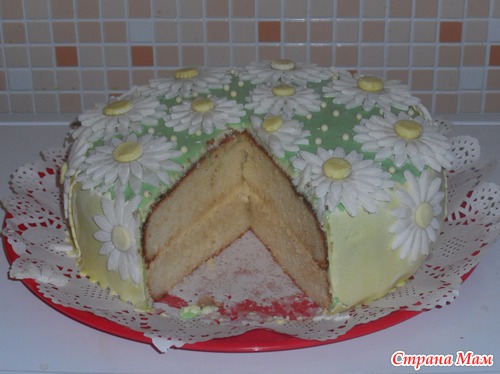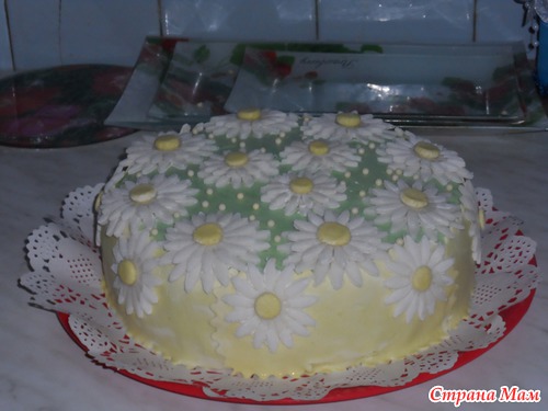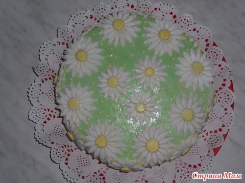 И украшаем по своему усмотрению. У меня мастика, в общем ромашковое поле