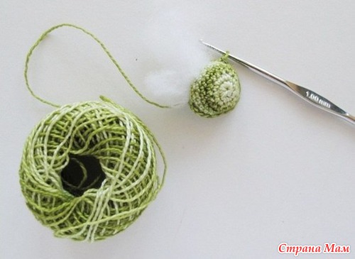 Вначале свяжем серединку зеленой меланжевой пряжей. Она состоит из двух частей, которые вяжутся по спирали.