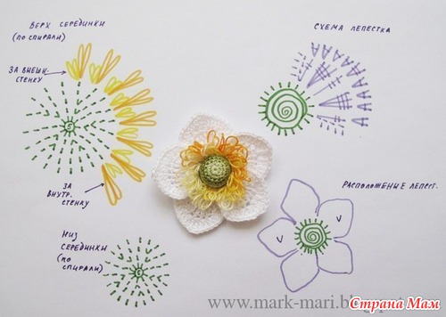 Белым "Ирисом" свяжем 5 лепестков. На схеме птичками помечены 2 лепестка которые находятся над остальными тремя.