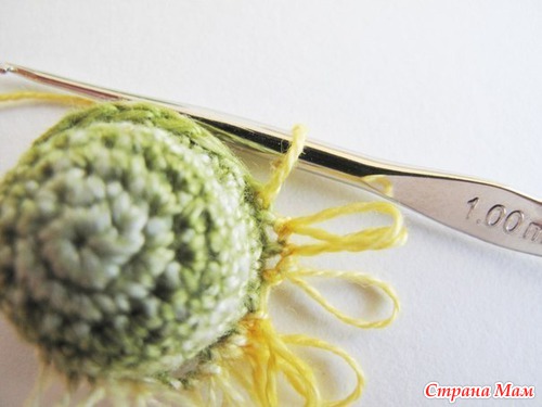За верхнюю стеночку петель последнего ряда зеленой серединки захватывайте короткие вытянутые петли светло-желтой пряжей, за нижнюю - длинные вытянутые петли темно-желтой пряжей.