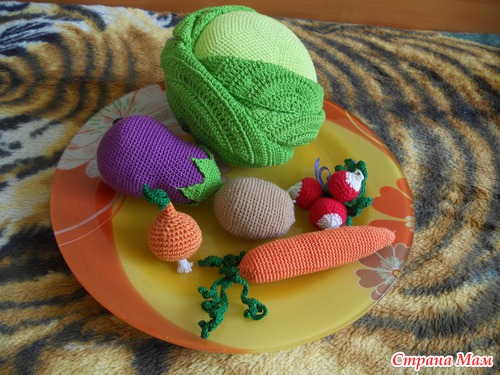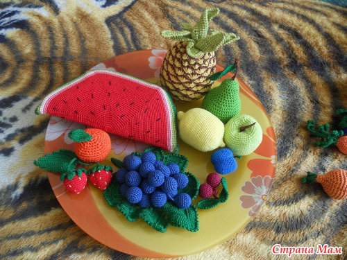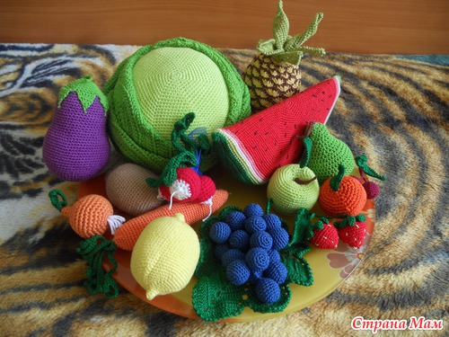 Попросили в детском саду связать фрукты и овощи, дали мне ниток "Ирис", но вязала и из своих, т. к. цветов подходящих не было. Получилось или нет, судить Вам.