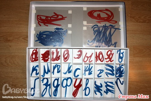 В коробке сделала ячейки, наклеив их из картона. Заглавные буквы "живут" довольно большими кучами на крышке этой коробки в пластиковых кармашках (не очень удобно, но пока ничего лучшего я не придумала). Кстати, о количестве букв. Первоначально я собиралась резать по 3 каждой. Но, хочу сказать, что можно обойтись и меньшим количеством.