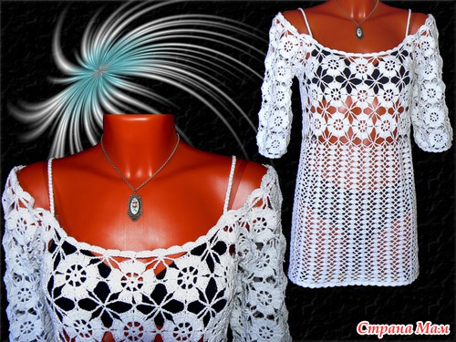 Продается. Размер 46-48. Хлопок с люрексом. Люрекс очень тонкий 5% в общем составе, поэтому легое поблескивание изделия и не колется. Хлопок хорошо на лето. Общая длина изделия по спине от плеча до низа 72 см. Размер манекена 44, поэтому для данного размера можно использовать как тунику. Изделие связано крючком, прямой силуэт, рукав закрывает локоть, плечи оголены, но не сползают за счет плечевого жесткого шнура, из которого сделаны и бретели.