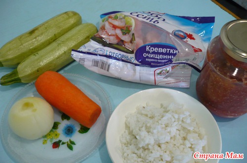 Итак наши ингредиенты -цукини, отв. рис, реп. лук, морковь, креветки, томатный соус, специи, соль, раст. масло, чеснок, фольга.