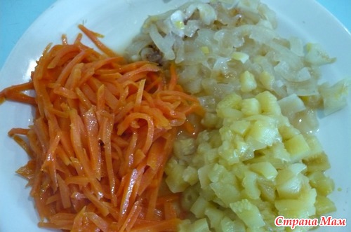 Морковь порезать соломкой, лук на 4 части и тоже соломкой. Вытащенный кабачок порезать кубиком. Все овощи обжарить в масле по отдельности до готовности.