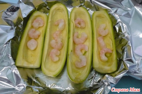 Кабачки присолить и положить на них креветки и выложить на сковороду.
