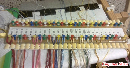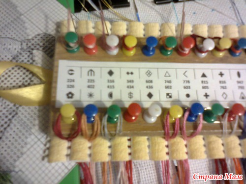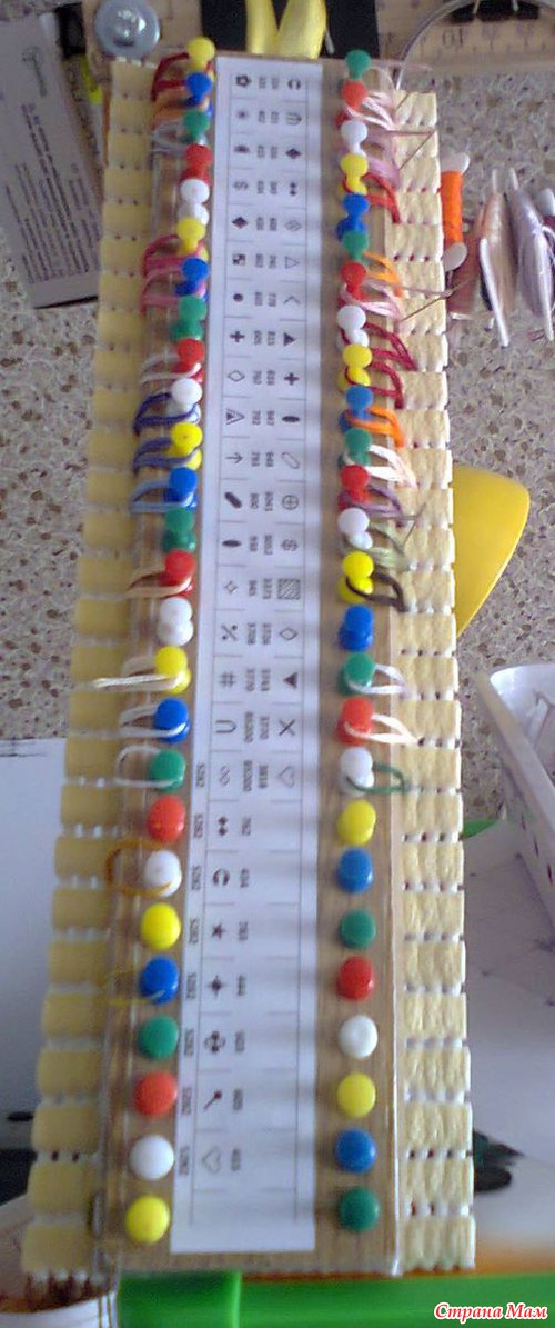Спортивного коврика я не нашла поэтому использовала полосатый коврик для душа, досточку деревянную муж принес с работы, ее я обклеила прозрачным скотчем (можно цветным). На коврик приклеила досточку, к ней кнопками-гвоздиками прибила полоску вырезанную из файла, распечатала линеечку со значками и номерами ниток, вставила ее под файлик и готово!!!