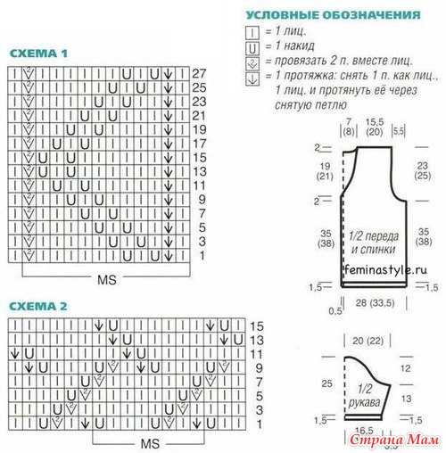 Внимание! При убавлениях и прибавлениях число накидов должно соответствовать числу провязанных вместе петель и наоборот. Начинать с 1 кром.. повторять петли раппорта, заканчивать петлёй после раппорта и 1 кром. Повторять с 1-го по 28-й р.