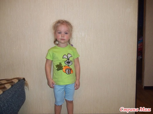 Футболка с зайчиком( зайчик и морковка полностью из пайеток) такая красивая, цвет зелёный, очень насыщенный. Ну и ещё одни бриджики