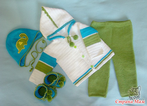 Задумывался комплектик белым, я предложила вариант темы "дракон", так как малыш родиться должен был в год дракона, заказщица поддержала, а потом увидела кофточку и было решено, что штаны нужны зеленые, ну и далее пошло поехало)))