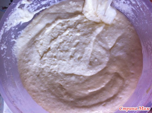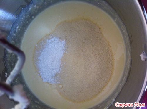 3. Добавить перемешанную с разрыхлителем манную крупу, хорошо перемешать.