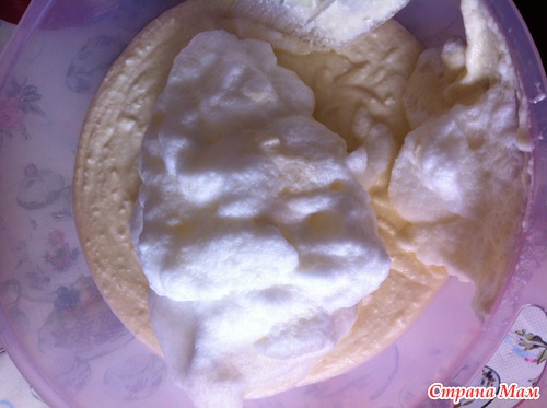 4. Белки взбить до устойчивых пиков, аккуратно ввести в творожную массу.
