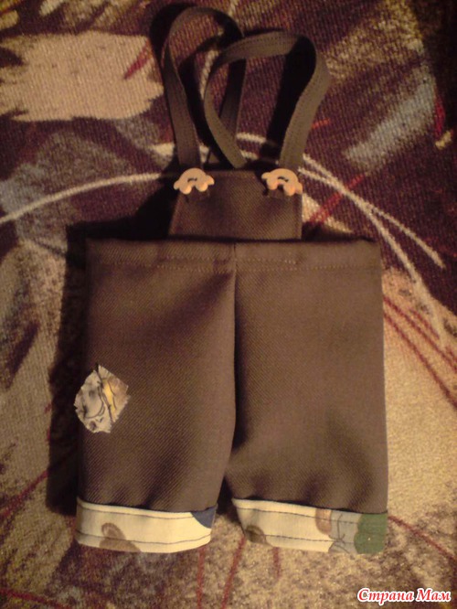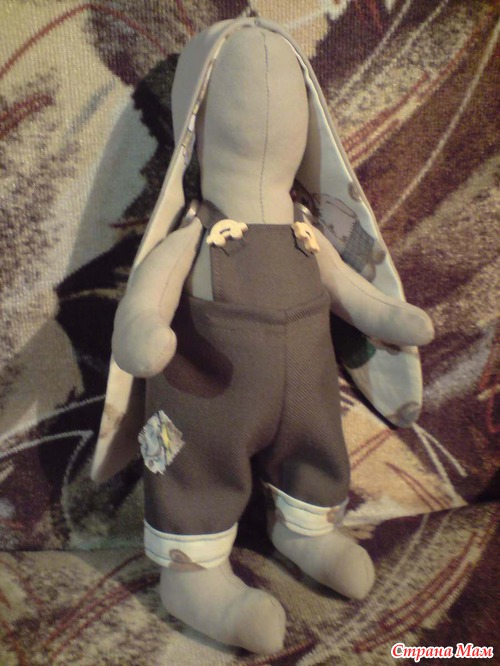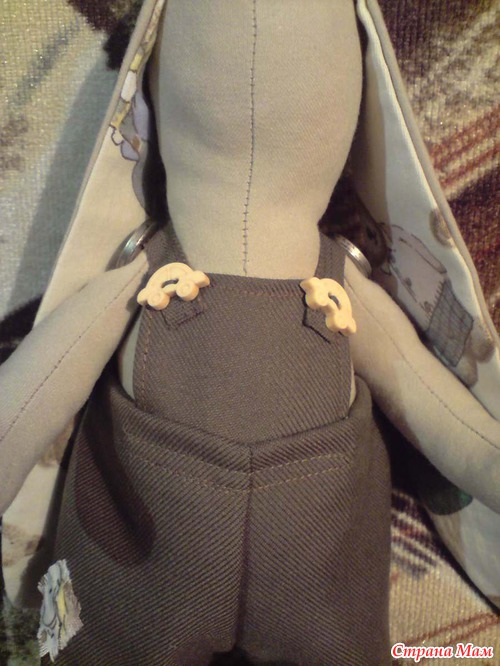 Одеваем зайку, закрепляя одежку к тельцу! Лямки пришиваем сзади после того как одели на зайку наш комбенизон.