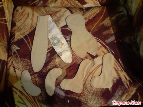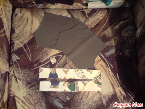 Перенесла на ткань, вырезала.. Так же вырезала полоски для манжетов, квадратик для передничка, пуговки и край ткани на лямки.